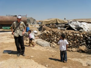 Arrived in Yatta today as daylight waned.  Our drive down was on public busses, a challenge with all our luggage, for sure.  I don’t travel lightly enough.  Yatta is a dusty city of one or two story dwellings, some with sheep pens on ground level.  We’re going up on the roof with our driver and translator in just a moment. We met with United Nations Organizing Committee for Humanitarian Affairs in Jerusalem this afternoon for a summary of the humanitarian impact of the occupation on Gaza and the West Bank citing trends over time, and then rushed for our luggage and the bus stops.  God is good, and we are here, frayed but none the worse for wear.  As tomorrow is an early day, this must be brief.  We will begin to go out to the villages and school accompaniments and so on first thing in the morning.  I’ve had a short Arabic lesson from Jawid, which I’ve quickly forgotten, sadly.  Maybe I will remember it tomorrow.  Inshallah.
