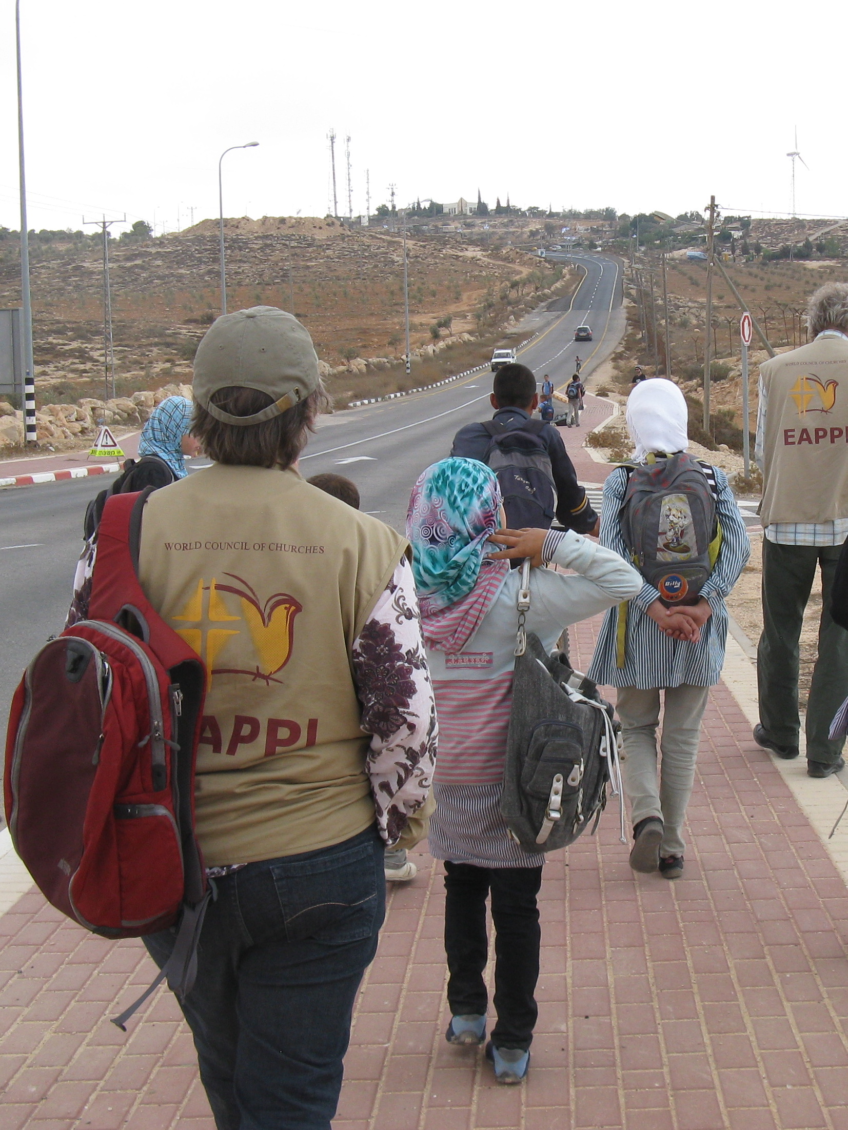 In another community in Palestine, children from the village of Tuba must walk between an illegal Israeli settlement and its illegal outpost to go to the neighboring primary school in ATawani. This is roughly a 20 minute walk. In the past, they have experienced such threatening harassment that the Knesset has legislated a daily military escort for the children.  Even so, this escort sometimes does not come, or does not guard the children, leaving a large space between the military vehicle and the children, and settlers have threatened them despite the presence of the military.  Internationals are not permitted to walk with the children for fear that this would be seen as provocative by the illegal settlers.  So instead of walking with the children, internationals position themselves visibly on nearby hillsides to watch through binoculars as the children walk and to note the license plate of the military escort.  If the military escort does not come, these internationals then join the children and take them overland by a longer route, which is still not entirely safe and takes about 40 minutes. Before this international presence was set up, the children had to walk a very long overland route to school, a two hour walk one way.  Since the international escort, the number of children daring to go to school has increased from just a couple to around 15.  To learn more about this,  see the Christian Peacemaker Teams/Operation Dove report, “The Dangerous Road to Education”, available to download here: